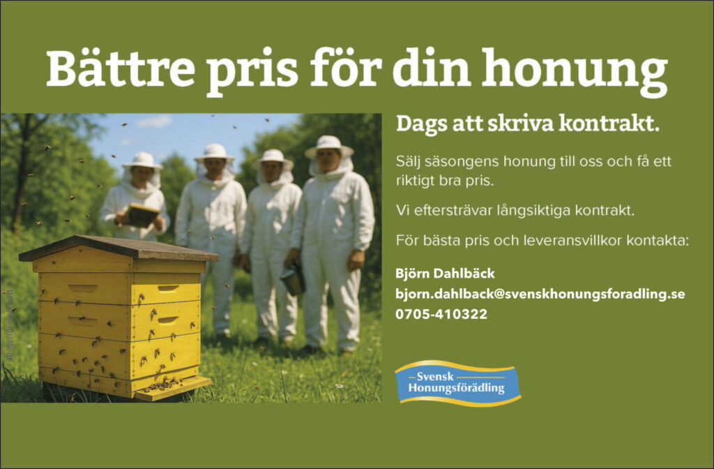Vi vill vara svenska biodlares bästa vän och skapa de bästa förutsättningarna för svensk honung. Våra köp av honung från dig som producent och leverantör kommer göras efter behov och fördelade över året. Har du honung att sälja redan nu, kan du kontakta Björn Dahlbäck på 0705 41 03 22.